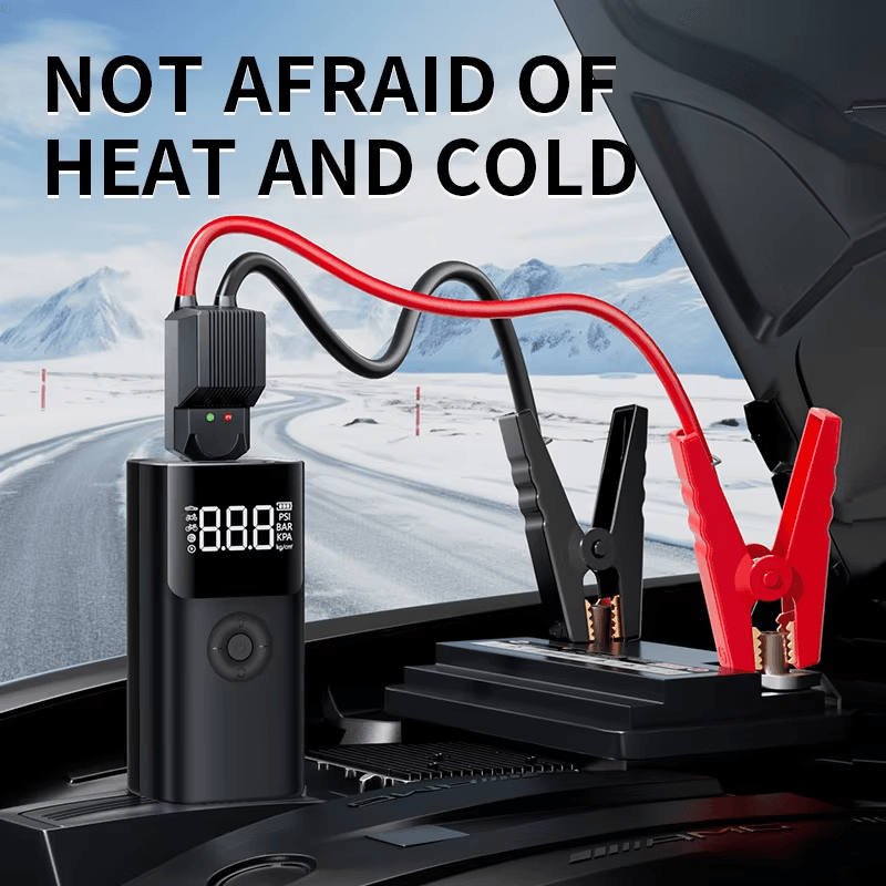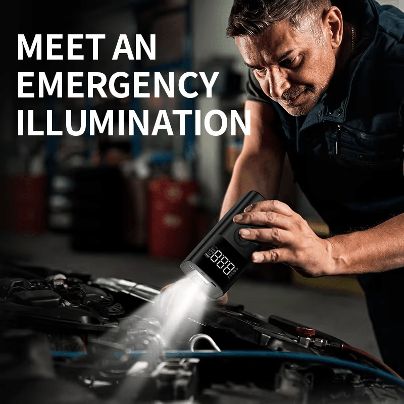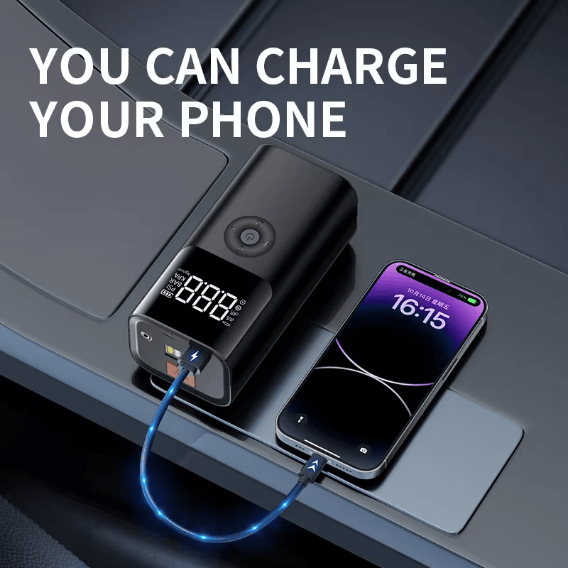 Jump starter portabil 12V, compresor aer 150 PSI, baterie externă 6000–10000 mAh, power bank. Perfect pentru pornește-auto rapid, pompare anvelope de urgență, alimentare USB, și utilizare ca kit auto multifuncțional de urgență.